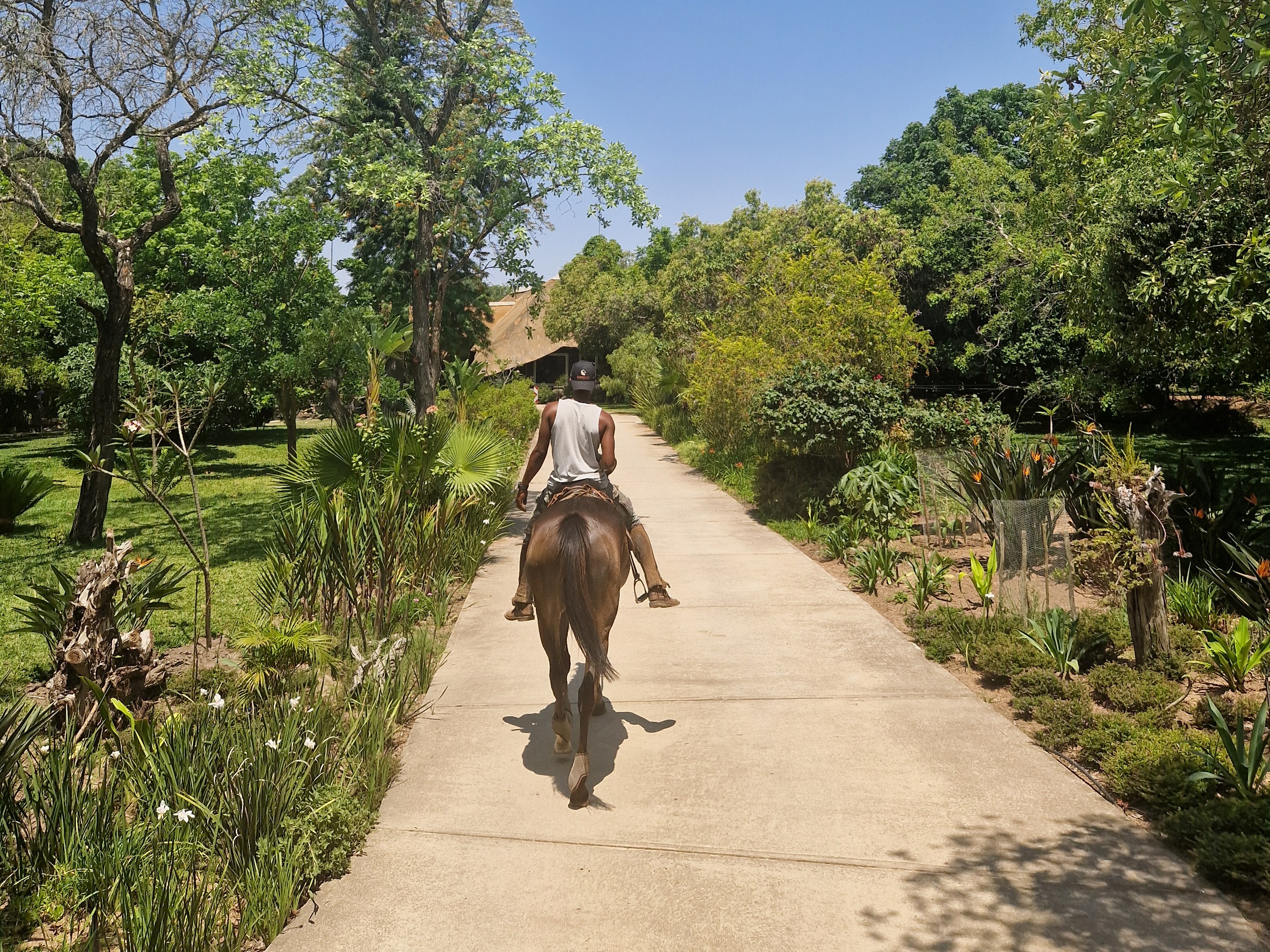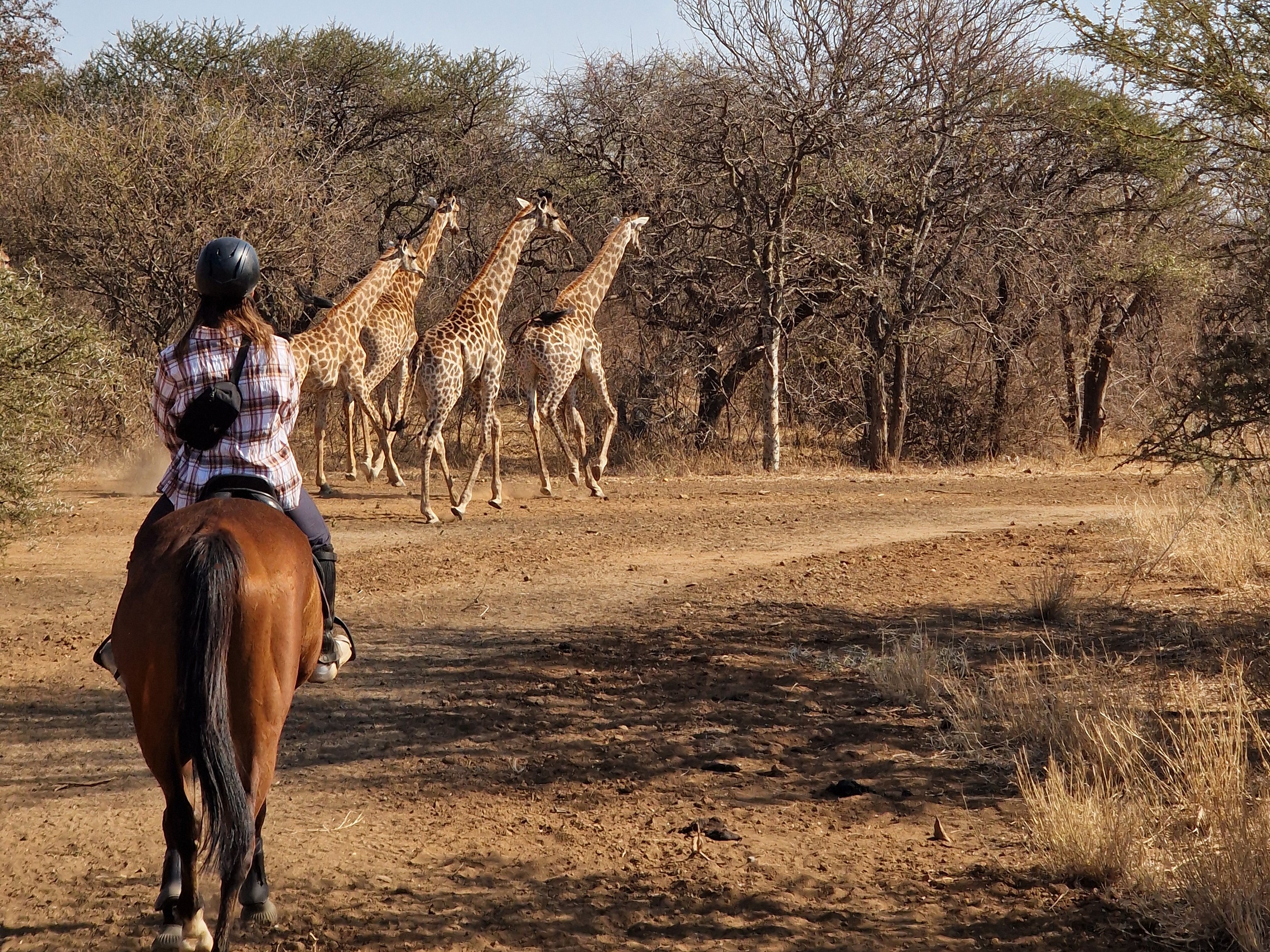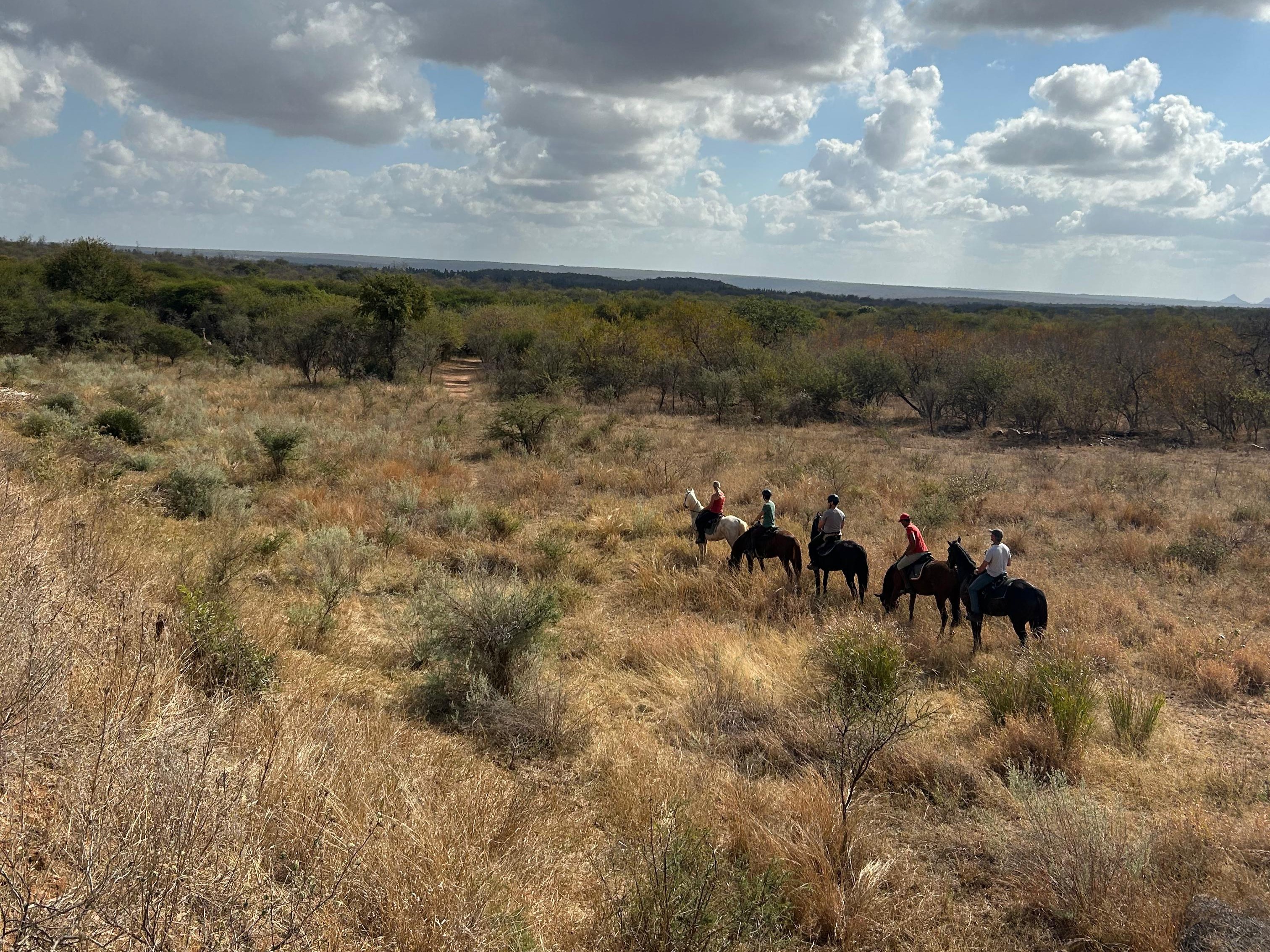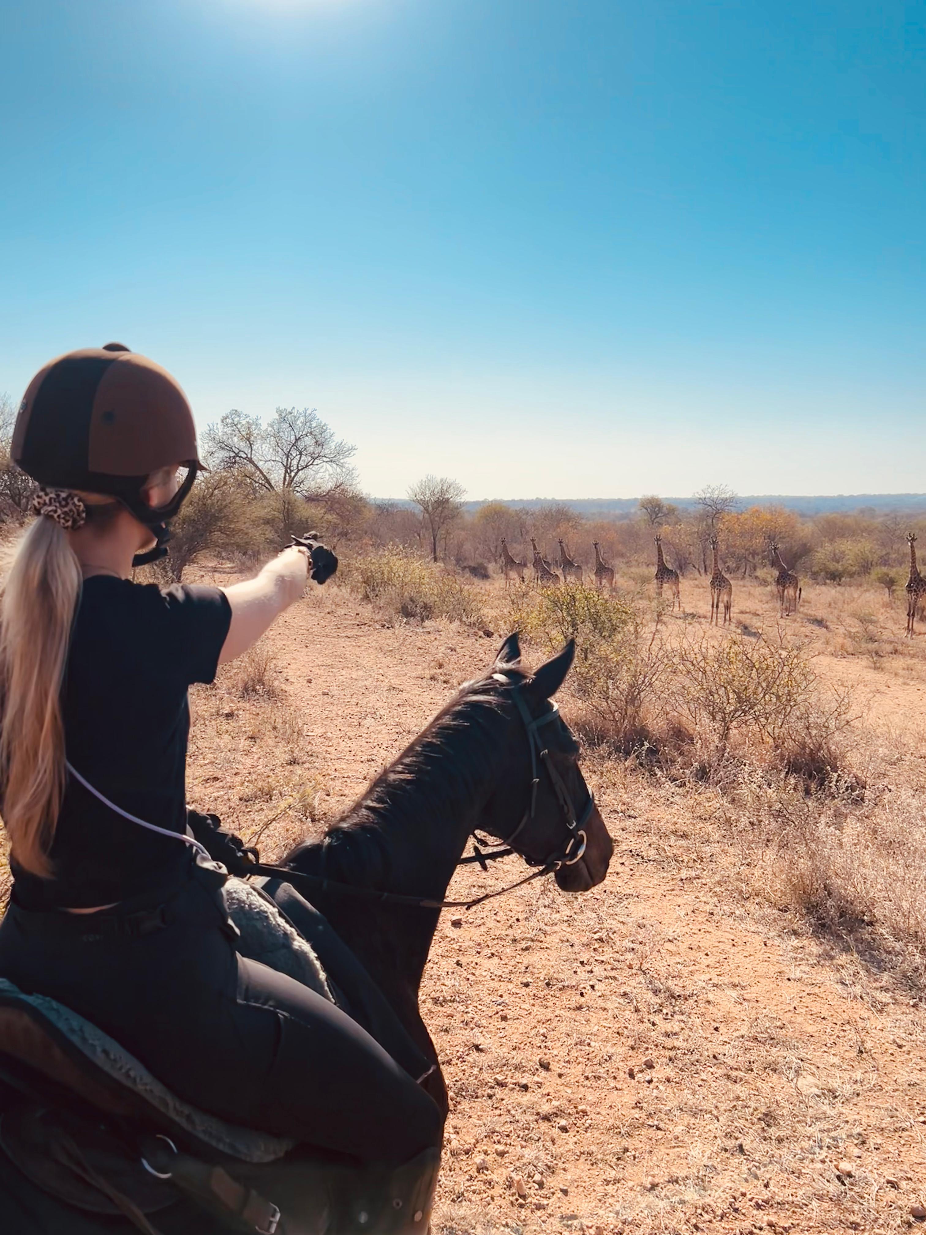Je rijdt dagelijks ongeveer 3 tot 5 uur, afhankelijk van het weer, door een zeer afwisselend landschap van mooie zandpaden, open savannes, rivieroevers en boomgaarden met citrusbomen. Onderweg zie je de wilde dieren, waaronder giraffen, zebra's, kudu's, struisvogels, gnoes, waterbokken, nyala, impala, wilde zwijnen, nijlpaarden en krokodillen. Er wordt gereden op zowel het eigen terrein als de omliggende terreinen, in totaal zo'n 1000 hectare aan natuur. Meestal maak je een ochtendrit van circa drie uur en een kortere rit van ongeveer twee uur in de middag, met volop mogelijkheden om te galopperen. Je zadelt en verzorgt je paard zelf voor en na de rit. Tijdens je verblijf rijd je op verschillende paarden. Eén keer per week wordt er een rit georganiseerd die wordt afgesloten met een drankje bij zonsondergang.