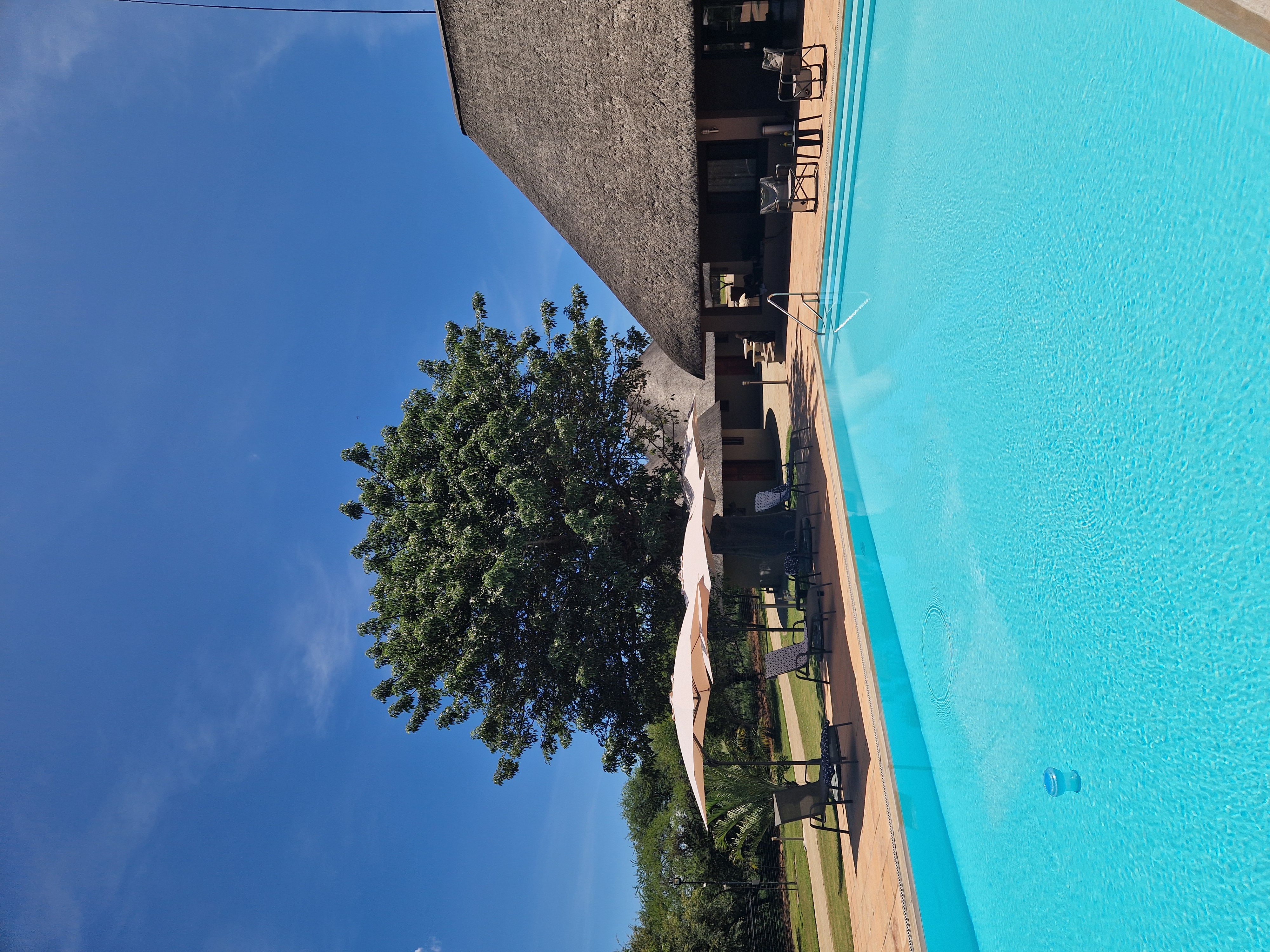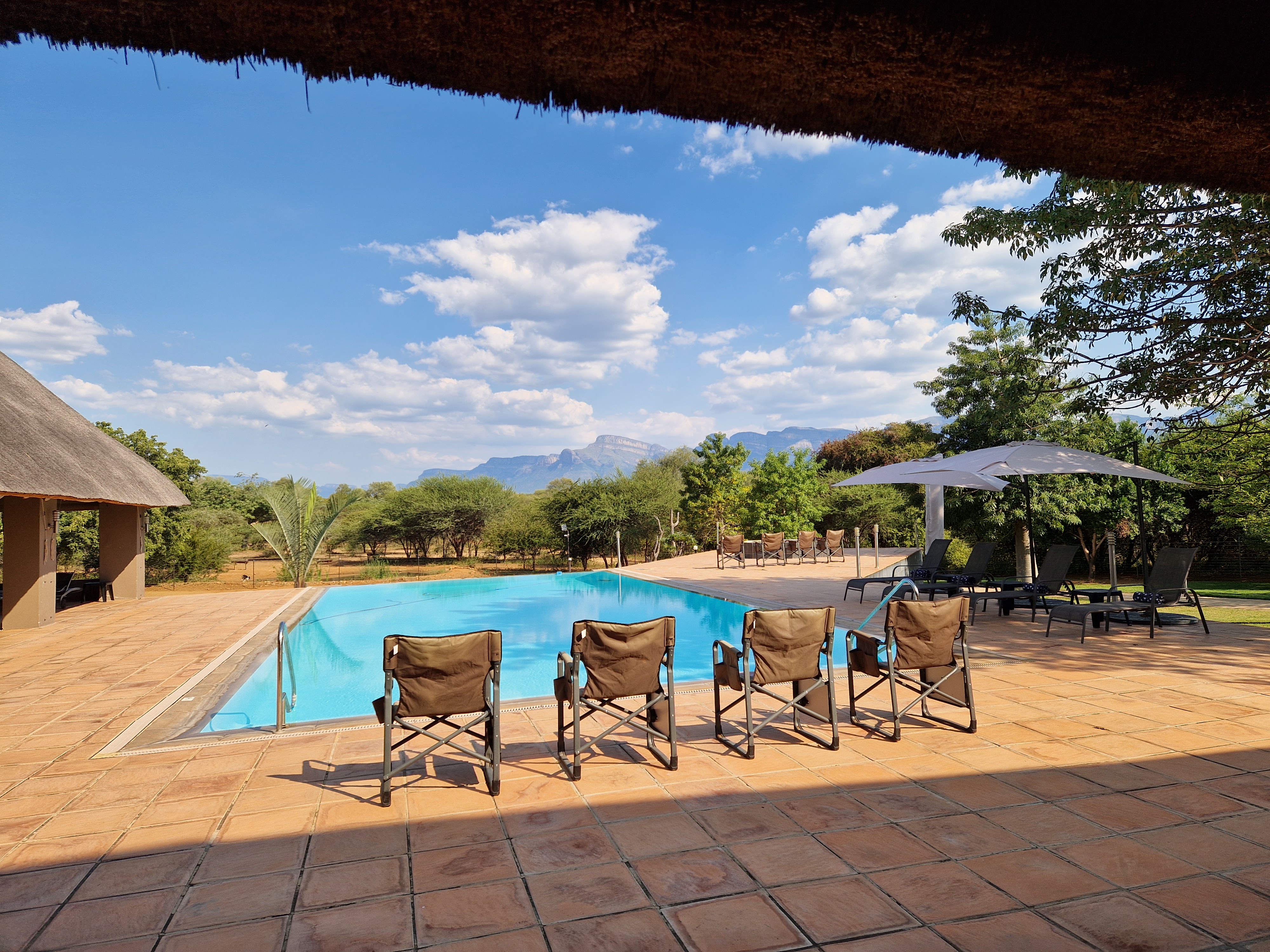 De moderne lodge beschikt over een groot zwembad met uitzicht op de bergen en een waterput waar wilde dieren, en soms zelfs de paarden, komen drinken. Je kunt ontspannen in de tuin met buitenkeuken, loungen op ligbedden bij het zwembad of ’s avonds tot rust komen op de bank met tv. In de lodge is overal goede wifi beschikbaar. Dankzij zonnepanelen en batterijen op het terrein is er ook stroom tijdens eventuele stroomuitval.